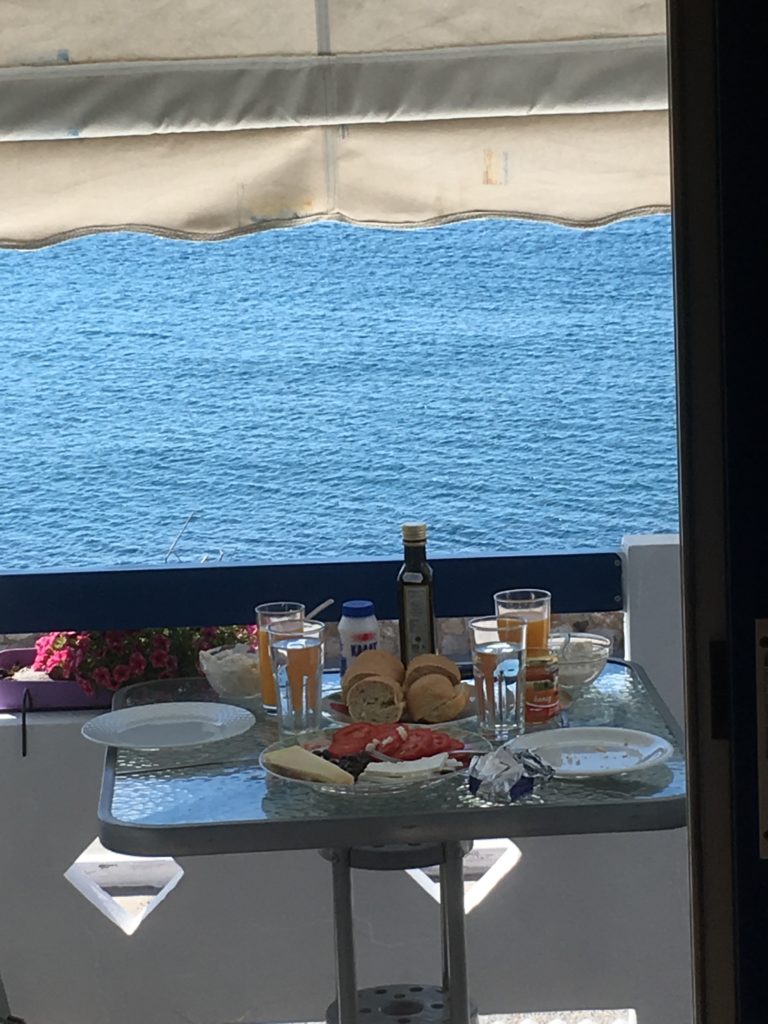 Petrakis Seaview – Unterkunft mit 2 m langen Betten . Die Zimmer waren sauber, die Betreiber sehr nett, und wir haben uns hier wohl gefühlt. Das Preis-/Leistungsverhältnis war gut. Wir waren im Osten mit Blick auf die Strandpromenade untergebracht. Auf dieser Seite der Halbinsel waren wir vor den starken Westwinden in diesen Tagen geschützt. Unser Balkon mit direktem Meerblick war klein, hatte aber eine Markise. Die Sonne hat hier im Juni schon viel Kraft, da ist eine Markise für uns „Nordlichter“ eine schöne Sache :-).