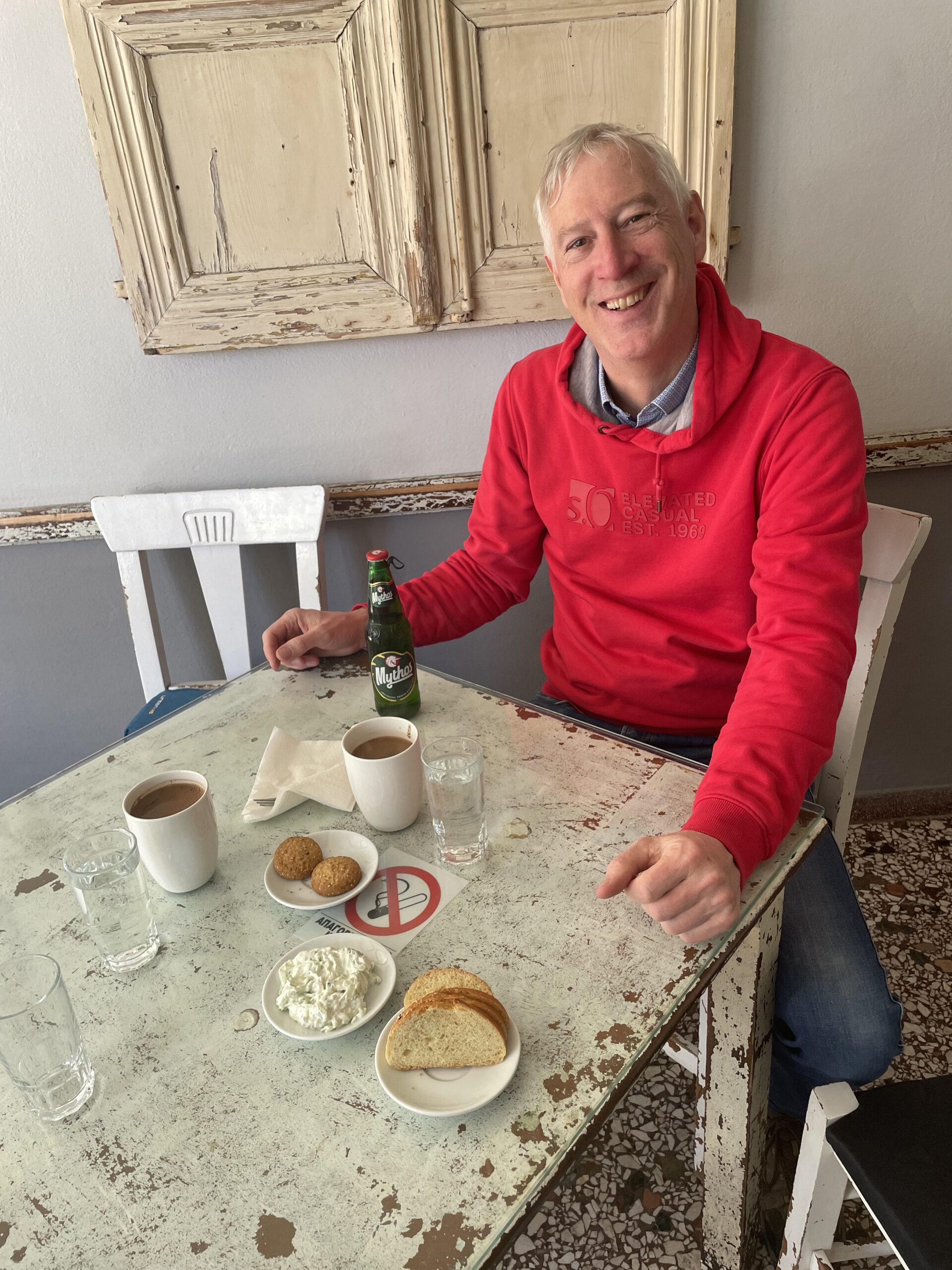 Unser erster Stopp war wie so oft To Steki in Mires. Da erst mal gemütlich frühstücken, durchatmen und ankommen – besser geht es für uns eigentlich nicht.